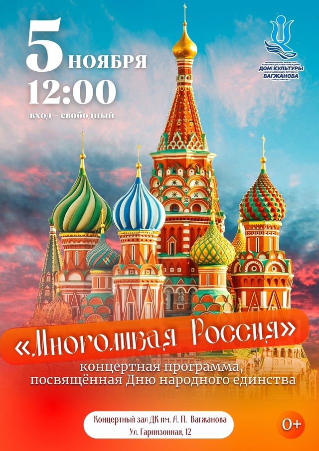 Приглашаем вас 5 ноября в концертный зал Дома культуры им. Вагжанова на праздничную концертную программу «Многоликая Россия», посвящённую Дню народного единства!