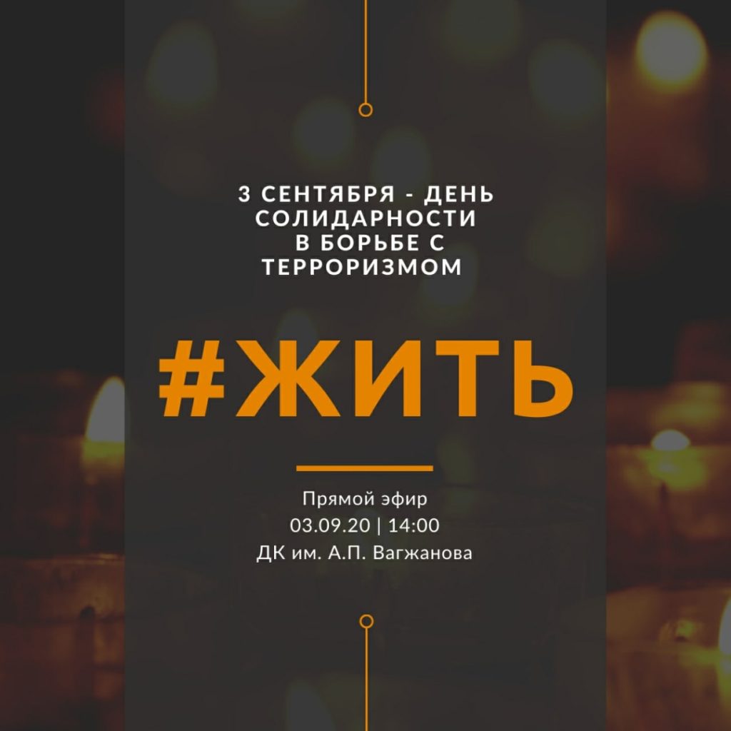 3 сентября — День солидарности в борьбе с терроризмом. Этот день приурочен к трагическим событиям, произошедшим в первые сентябрьские дни 2004 года в г. Беслане. ДК им. А.П. Вагжанова не остается в стороне и именно 3 сентября в 14:00 состоится прямой эфир «#ЖИТЬ«. Наш час Памяти – наша скорбь и боль о погибших, наша солидарность с жертвами трагедий.