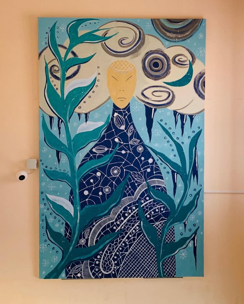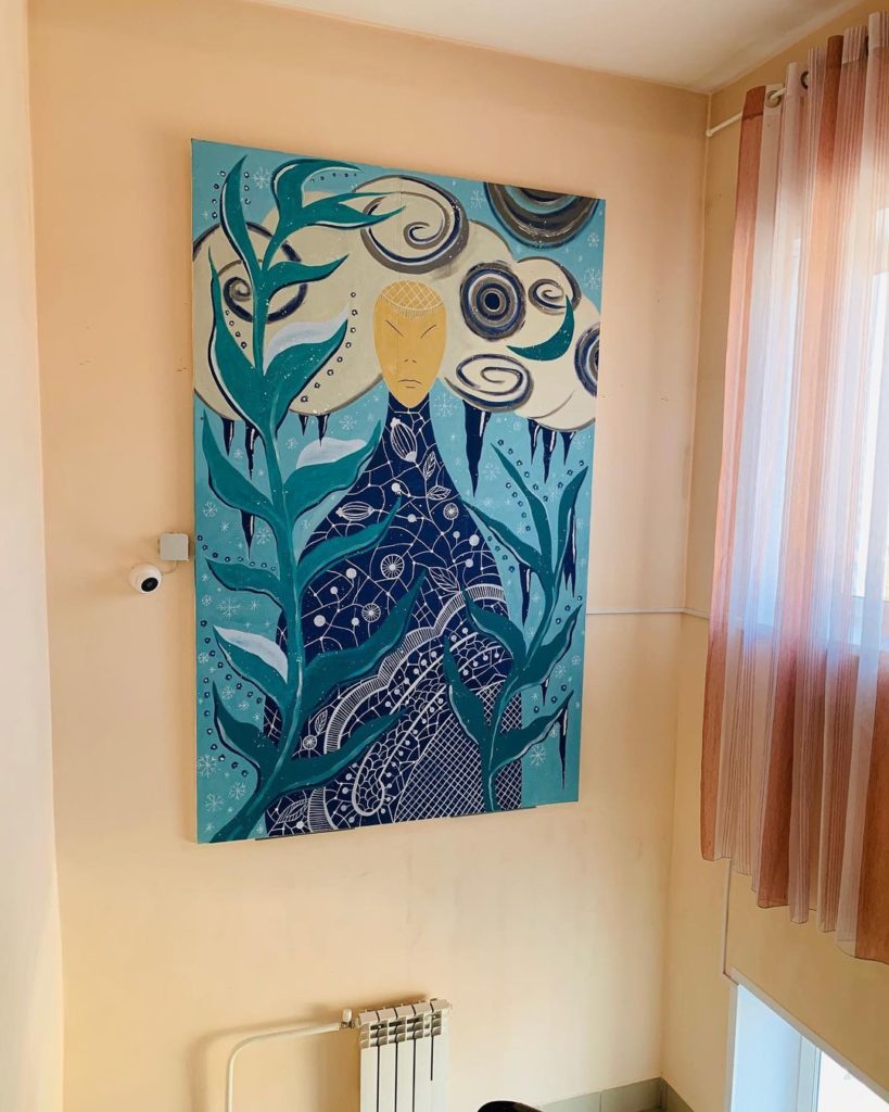 Работа выполнена акриловыми красками в холодных тонах.