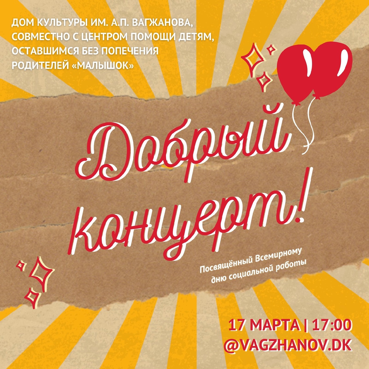 17 марта в 17:00ч. состоится концертно-развлекательная онлайн программа «ДОБРЫЙ КОНЦЕРТ», посвящённый Всемирному дню социальной работы. Специалисты Дома культуры подготовили для воспитанников Центра помощи детям, оставшимся без попечения родителей «Малышок» творческие … Читать далее →